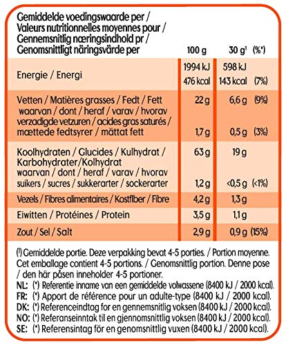 Ingrediënten: aardappelpoeder, aardappelzetmeel, zonnebloemolie, kaas- en paprikasmaak [aroma (bevat KAAS, ui- en knoflookpoeder, paprikapoeder), weipoeder (van MELK), smaakversterker (mononatriumglutamaat), voedingszuur (citroenzuur)], zout.